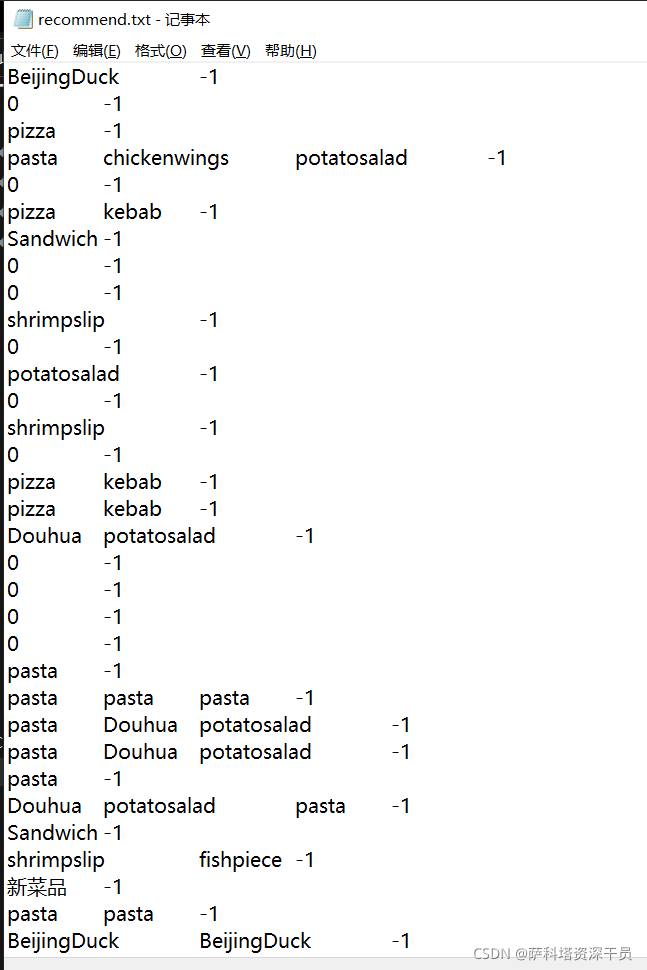 其他的链表都还好办。至于这三个链表,我们建立了3个txt文件(虽然listdish和recommend有许多链表,但是最好还是都存在一个txt里,不然每次新点订单还要新建txt文件。)其中listdish和recommend文本文档是这样的: