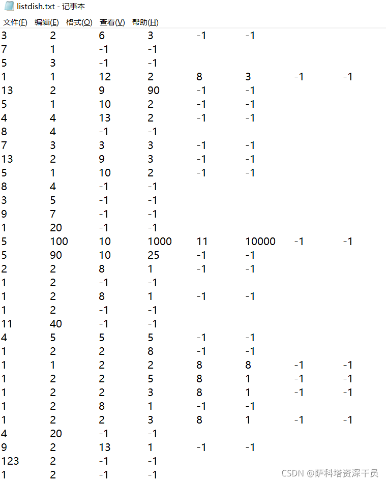 每一行代表第几个订单。每两个数字为一组,第一个数字为菜品号,第二个数字为该菜品所点数量。由于不固定长度,我们采用两个-1作为结尾,当读到-1时本订单结束。