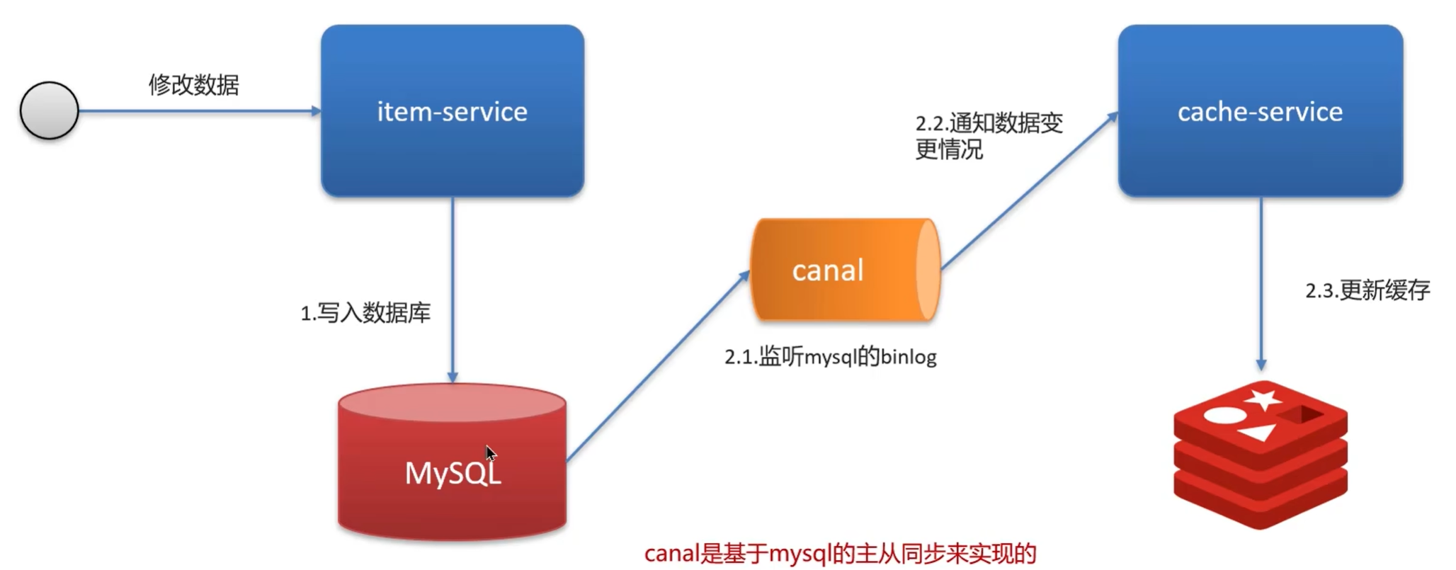 使用 MQ 中间中间件,更新数据之后,通知缓存删除。 利用 canal 中间件,不需要修改业务代码,伪装为 mysql 的一个从节点,canal 通过读取 binlog 数据更新缓存。