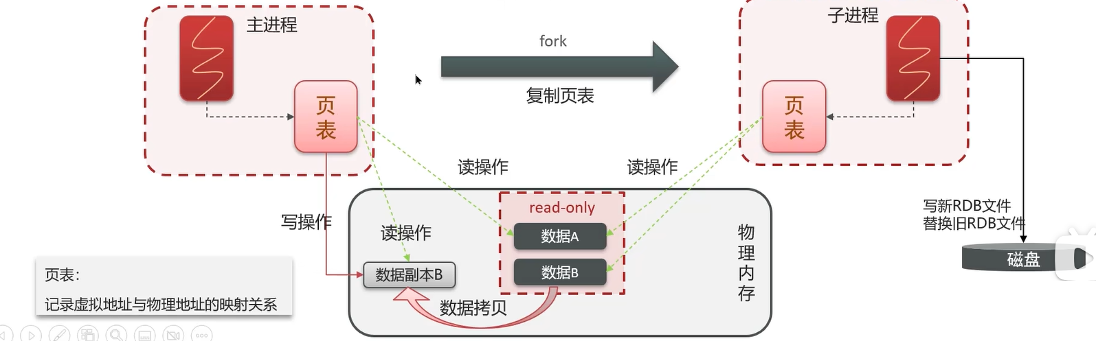底层原理:如下,子进程拷贝页表进行备份。这期间主进程写操作会复制出来一份数据进行读写,避免脏数据。