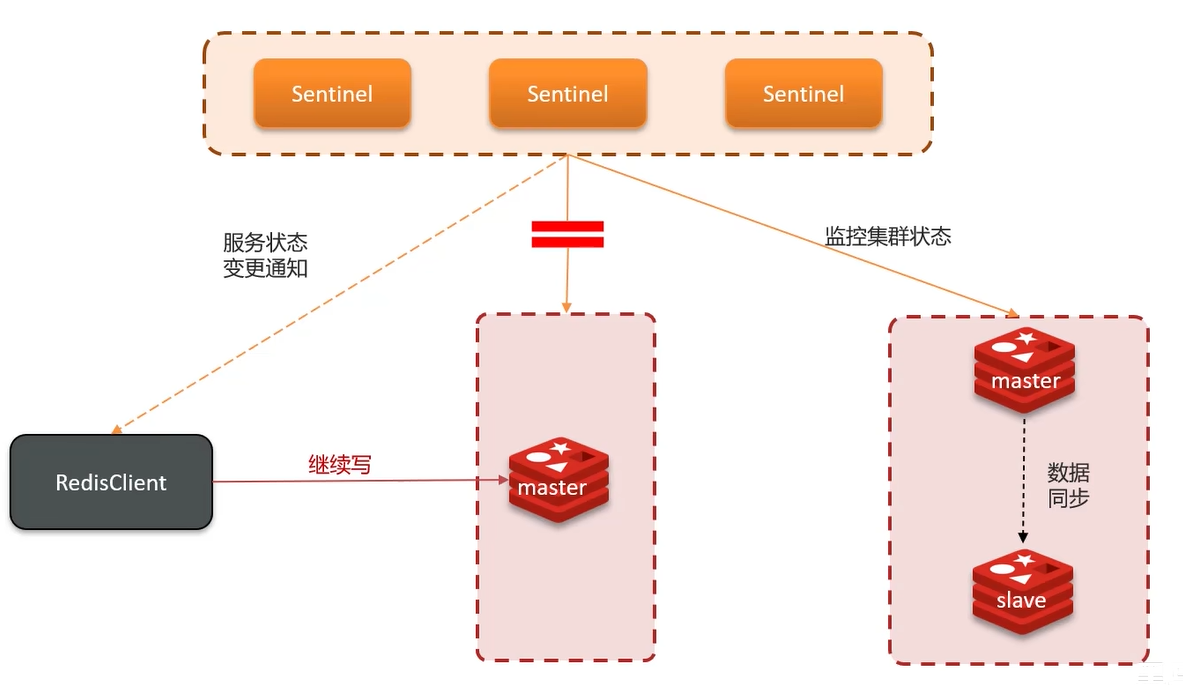 - 如果主节点宕机,提升一个从节点为主节点。旧主节点恢复工作了,也以新主节点为主。