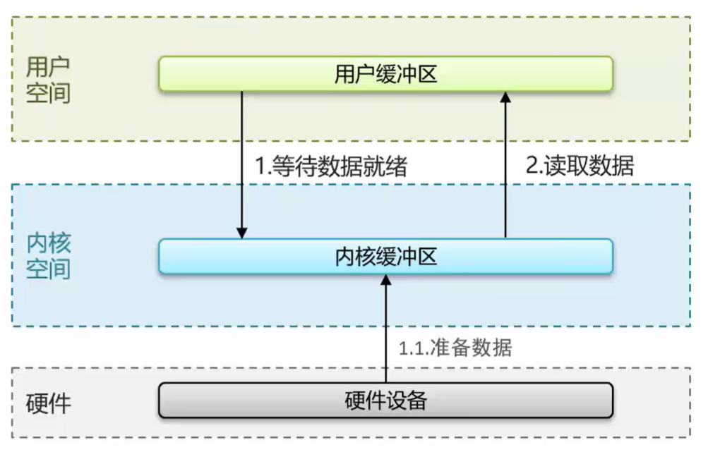 如下是 Linux 的用户空间 内核空间的图解。用户空间的执行命令,资源调用权限有限,内核空间则可以调用一切资源。读写操作是硬盘数据拷贝到内核再拷贝到用户空间,或用户空间缓冲数据拷贝到内核空间再拷贝到硬盘。比如别人给我发微信,是网卡->内核空间->用户空间。
