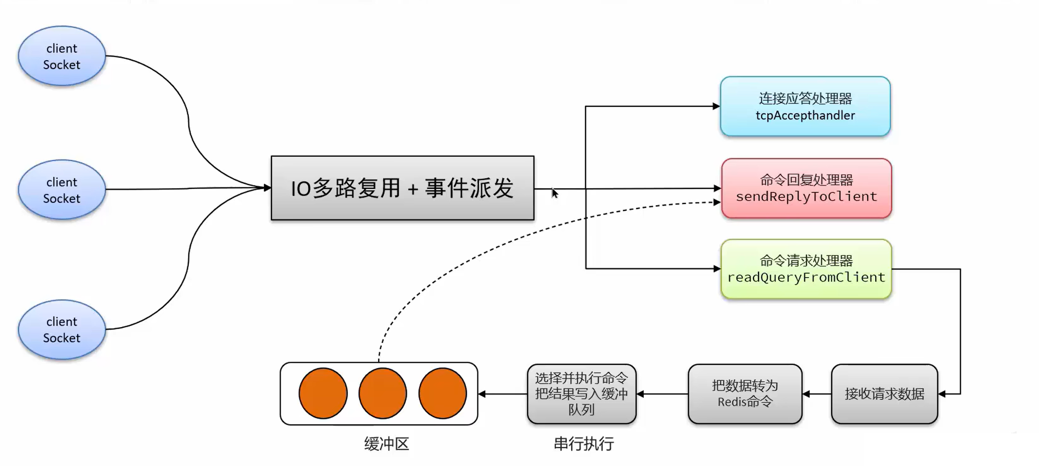 下图是 Redis 的网络模型,使用 IO 复用结合事件处理器来同时应对多个 socket 的请求,IO 多路复用通知用户 socket 就绪后,派发不同的事件处理器进行处理,比如应答连接,回复命令(写),命令请求(读)等。