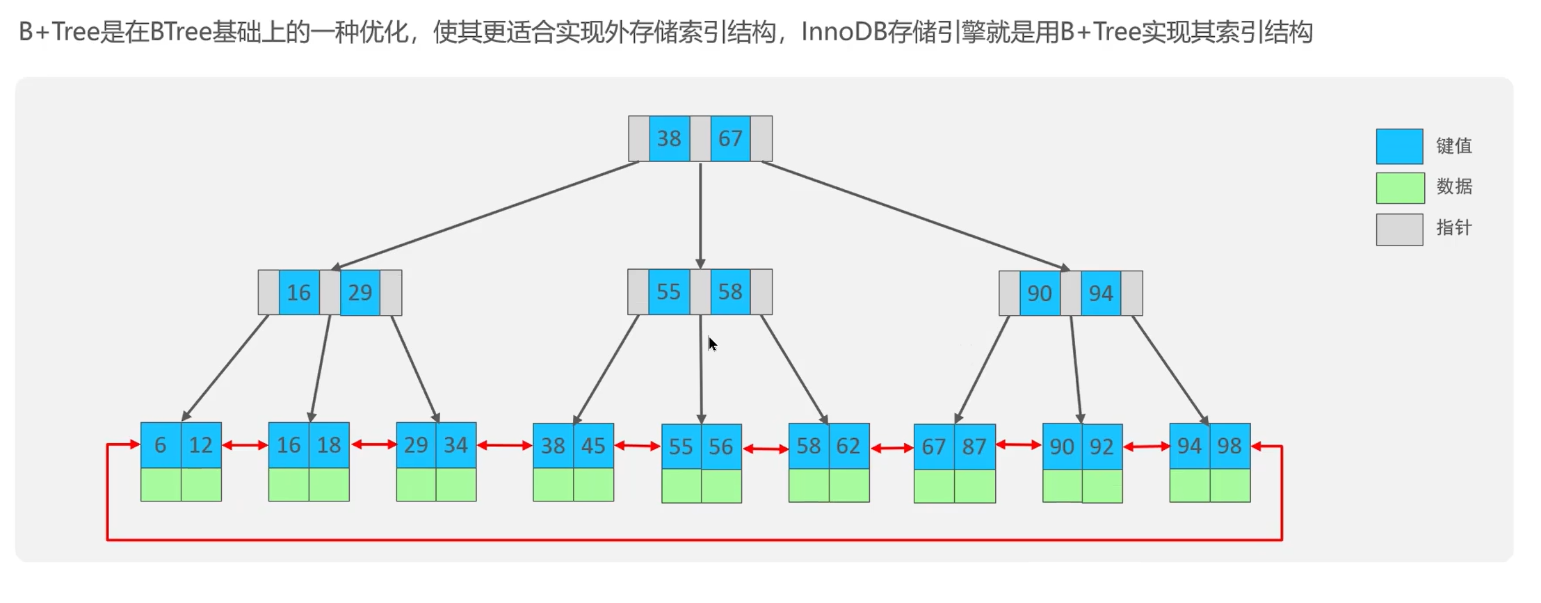 MySQL 底层的B+树数据结构对特定字段进行优化查找。比如查找55岁的人,正常查找就是从表最上面到下面查找,对年龄字段生成 B+树之后就可以高效查找。