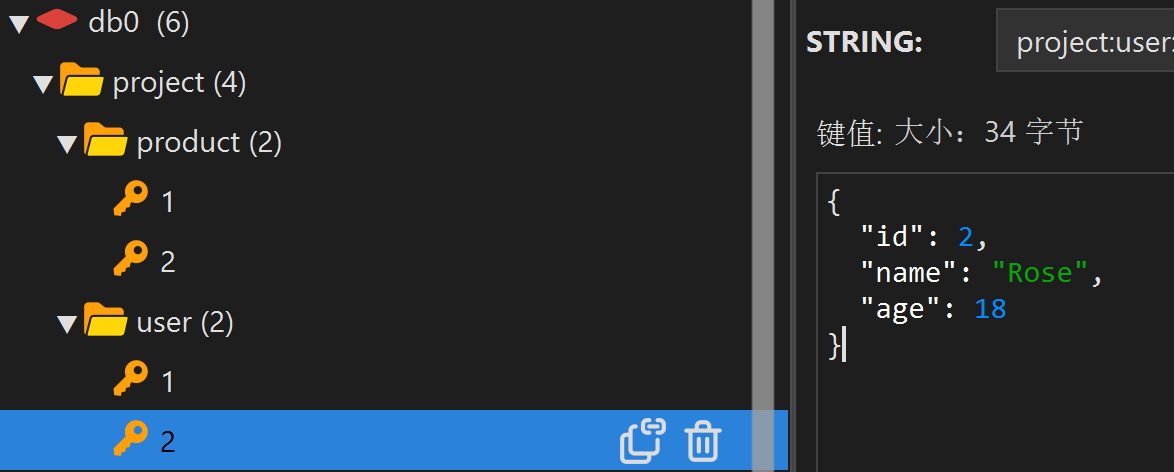 127.0.0.1:6379> set project:user:2 '{"id":2, "name":"Rose", "age": 18}'