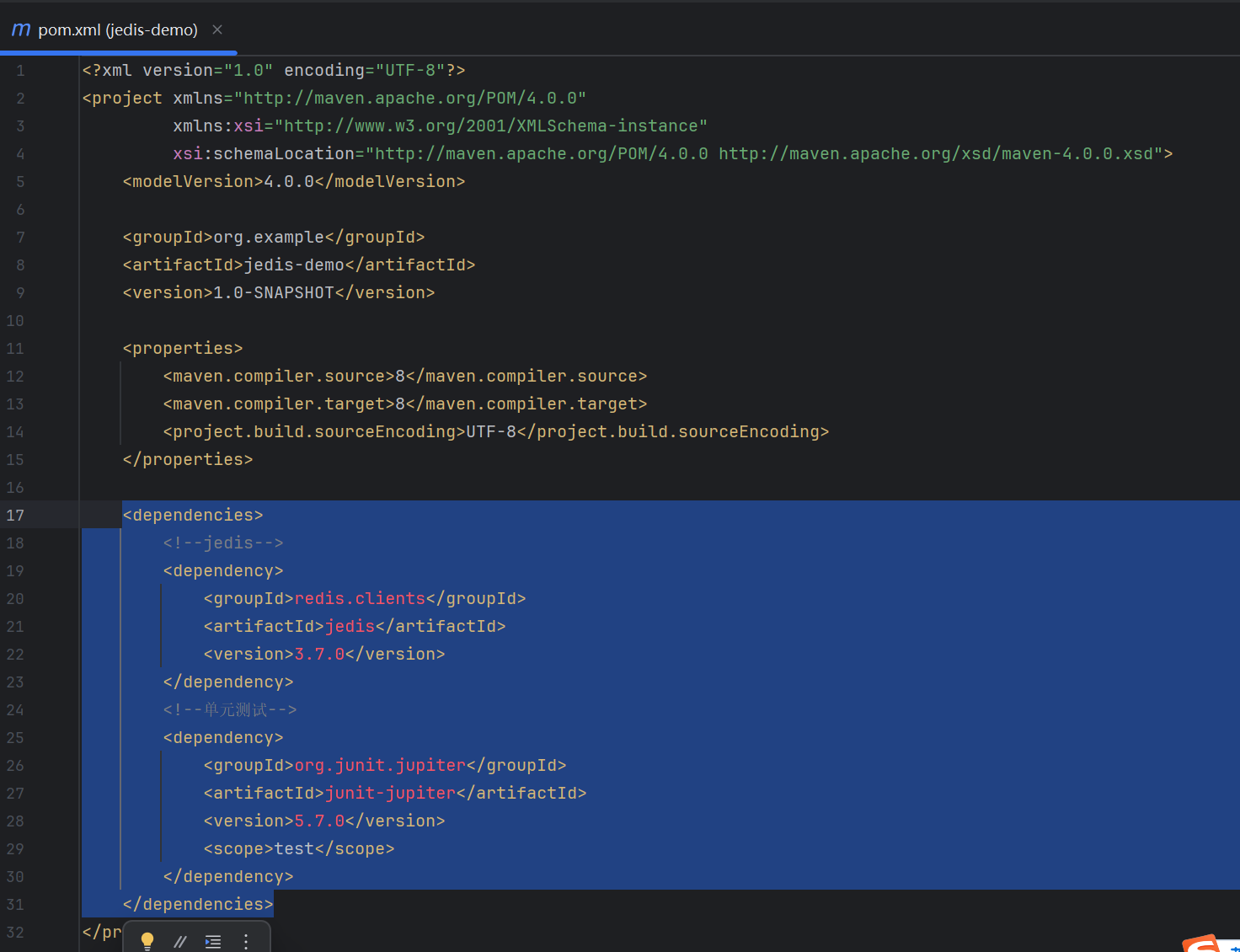 max-wait: 100msSpringDataRedis 默认引入了 Lettuce 的依赖,如果想在上面的配置文件中使用 jedis 也可以只不过就是需要在 pom.xml 里面也引入 jedis 的依赖。