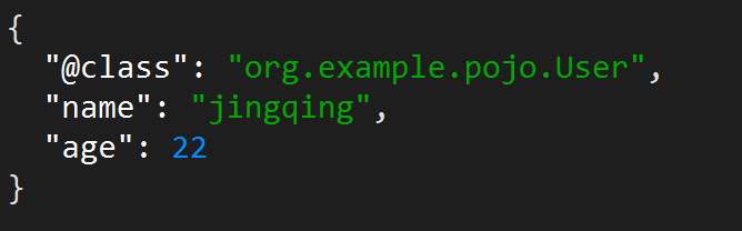 尝试传入对象也非常顺利,假设新建了一个 User 对象,数据库中成功传入后的 json value 如下(第一句话就是帮助反序列化还原用的):