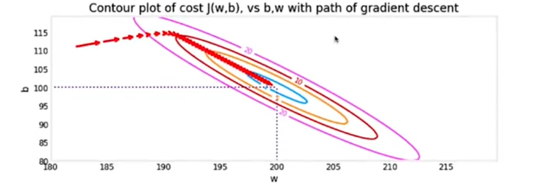 对于这个例子我们要找到的代价函数最小值点就是中间那个凹进去的地方对吧。