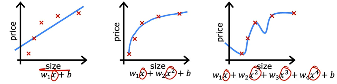 如下图,左边的模型欠拟合(underfit)因为模型复杂度不够;而右边的模型过拟合(overfit)因为参数太多模型过于复杂了,导致模型能非常好地拟合训练数据,但是对于训练数据之外的数据预测效果不好。