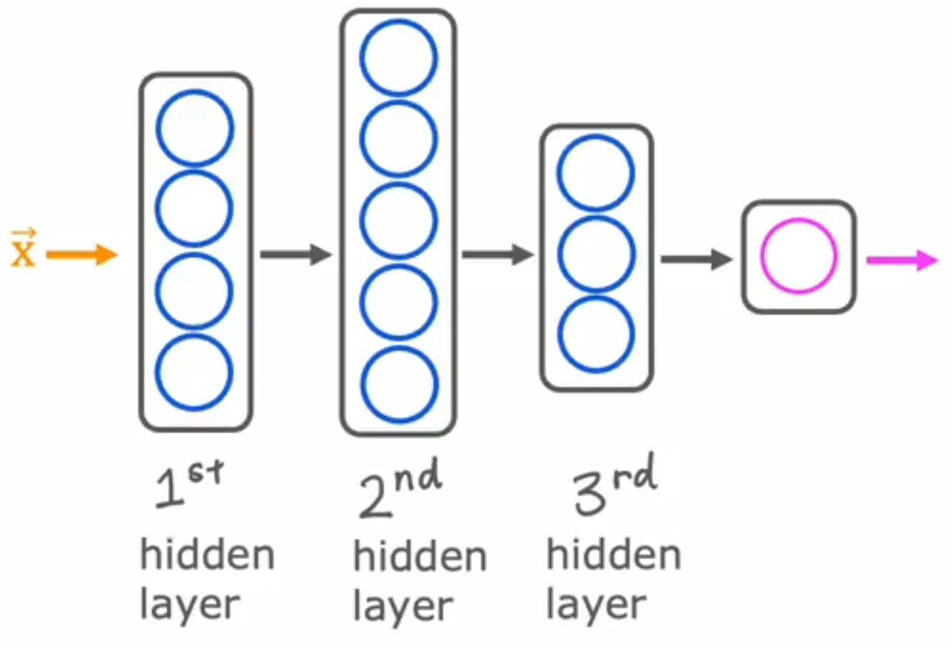 输入数据被称为输入层(input layer),一般不计入总层数。中间的层都叫隐藏层(hidden layer),最后一层叫输出层(output layer)计入总层数,比如上面这个例子是一个 4 层神经网络。