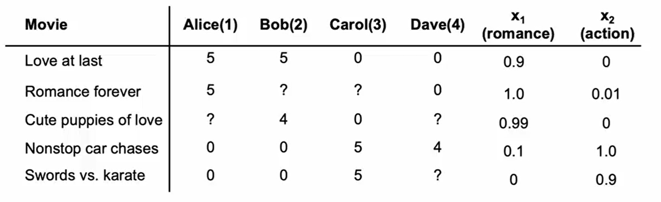 比如如下案例,我们想根据每个用户过往给看过的电影打分,预测其会给没看过的电影打多少分。