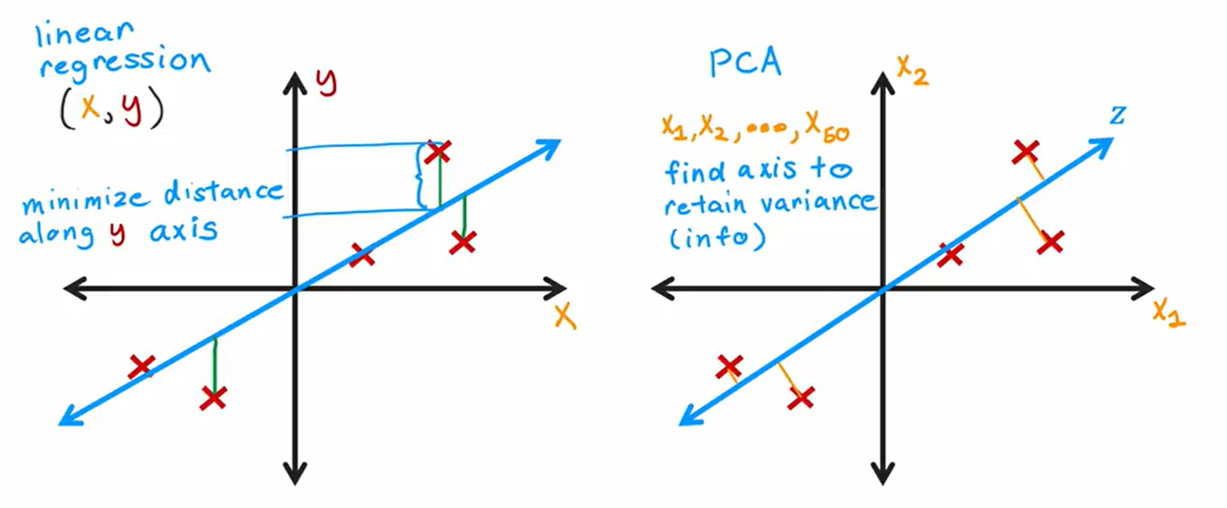 PCA 比较容易和线性回归混淆。线性回归的 y 是标注输出数据,我们要根据 x 预测 y 并根据和真实值之间的差距迭代修改算法。而 PCA 是无监督学习,我们要找到一个维度让原数据二维坐标投影到上面的距离平方和最小。