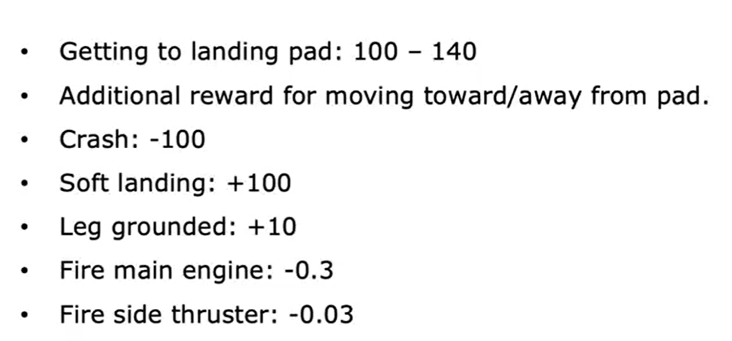 如下是一些奖励函数,是否落在登陆区域;距离登陆区域的左右偏移量;坠毁;软着陆;腿着陆;以及避免消耗太多燃料。折扣因子 0.985.