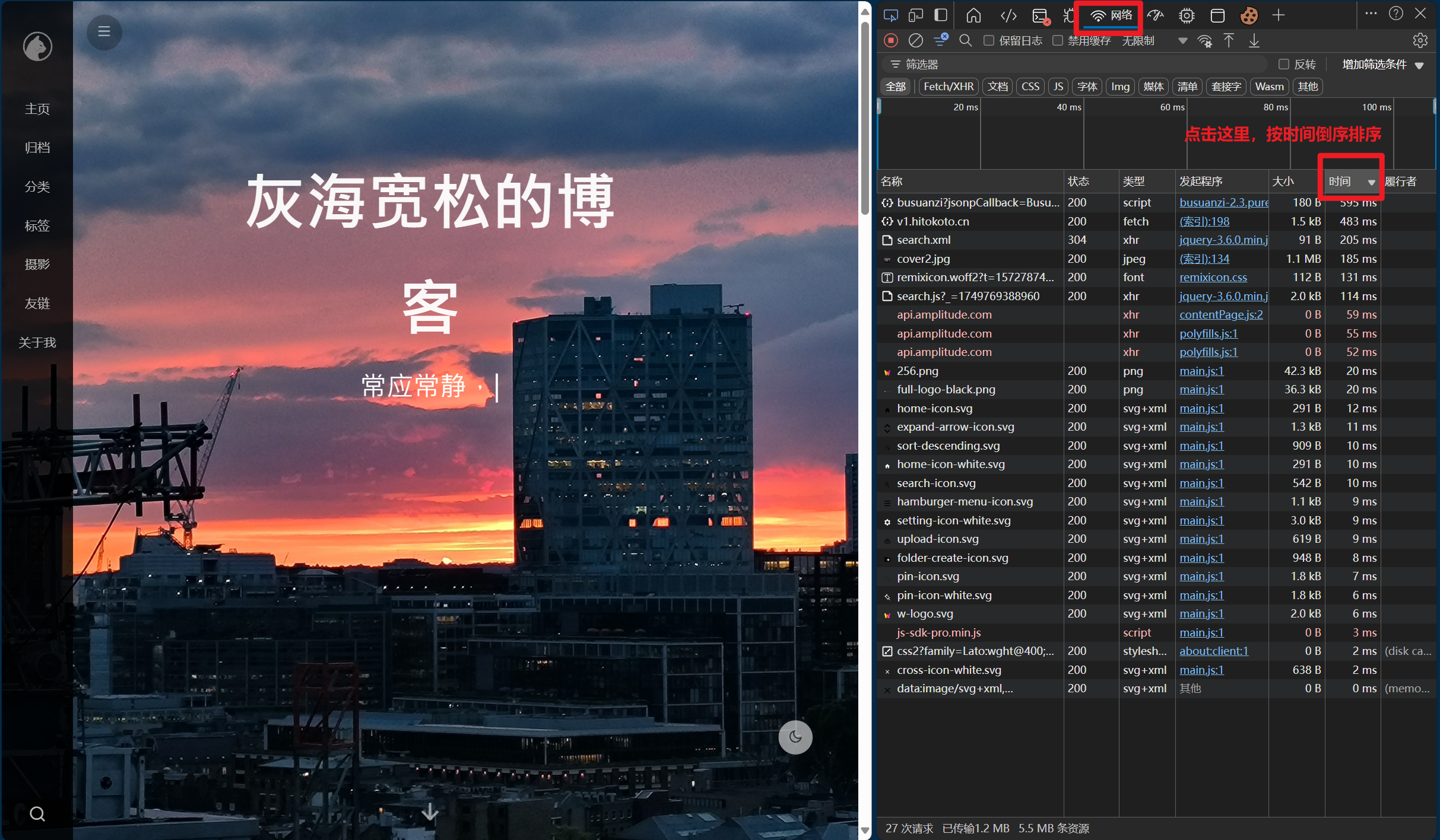 在自己的网站页面(部署的网站地址 https://xxx.github.io,或者自己的网站域名,或者本地部署预览 localhost:4000),打开开发者模式(F12 或 Ctrl + Shift + C)查看 Network 网络页面的具体加载时间,点两下时间按时间倒序排序: