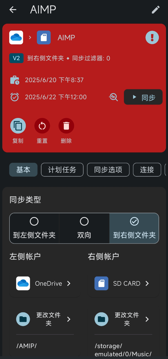 如下图,我设置左侧为云盘文件夹,右侧为手机文件夹,每日下午12点从左侧文件夹同步到右侧文件夹(我不怎么在手机上添加修改音乐,所以主要是电脑更改完同步给手机的需求)。如果着急听到新歌,可以点击按钮立即同步。